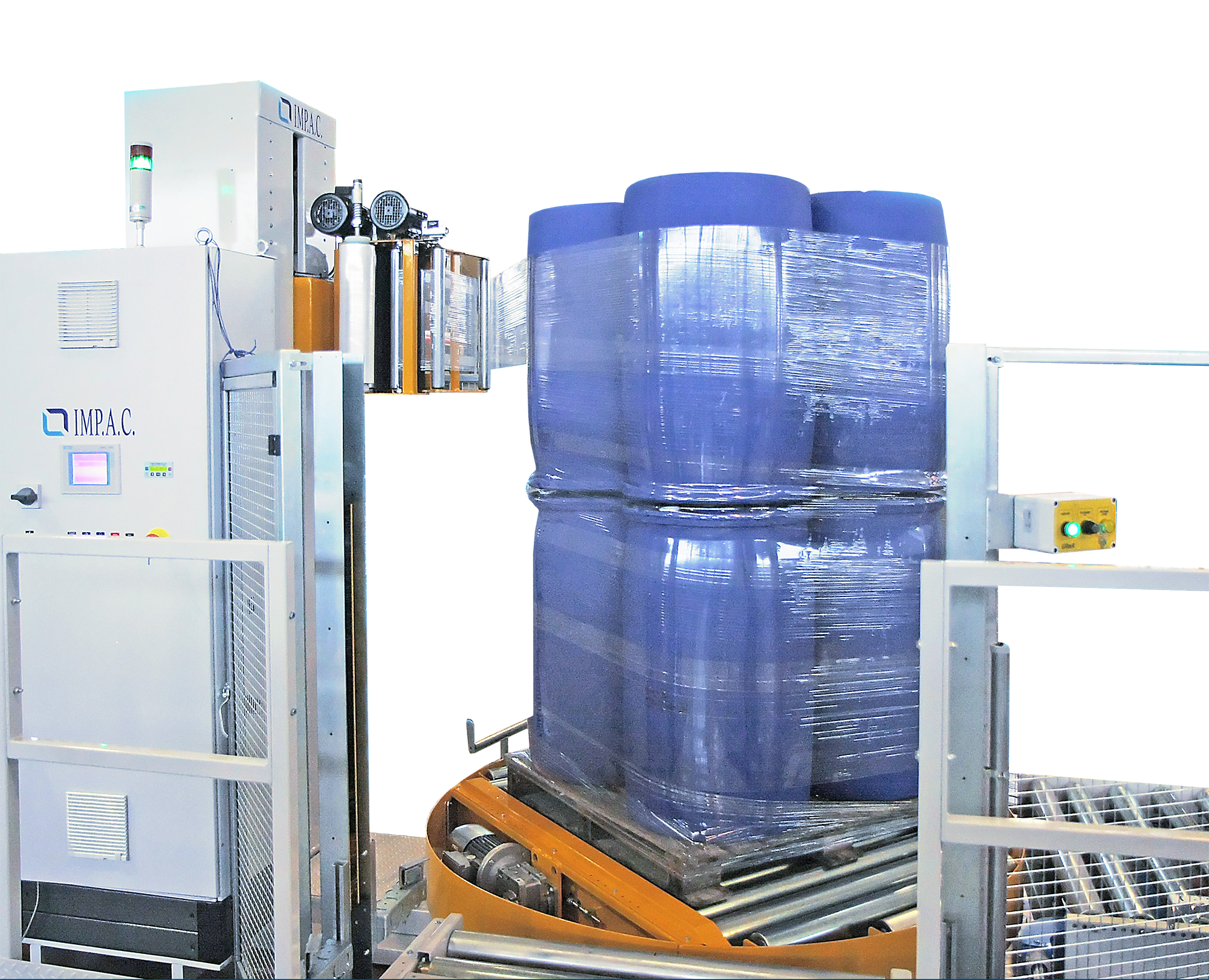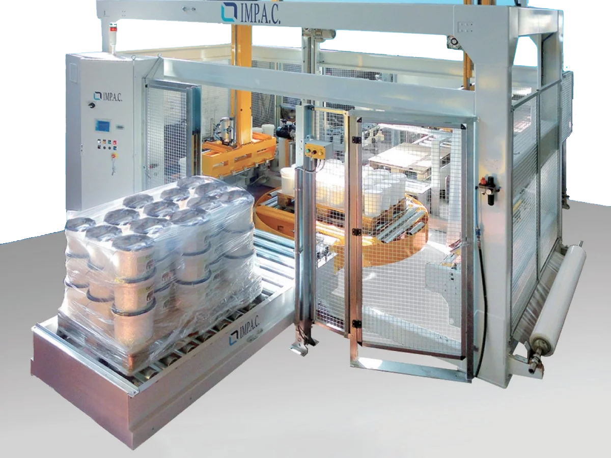 The IMP.A.C. PR A is an automatic pallet wrapper designed to wrap pallets quickly and efficiently in a fully automatic cycle.