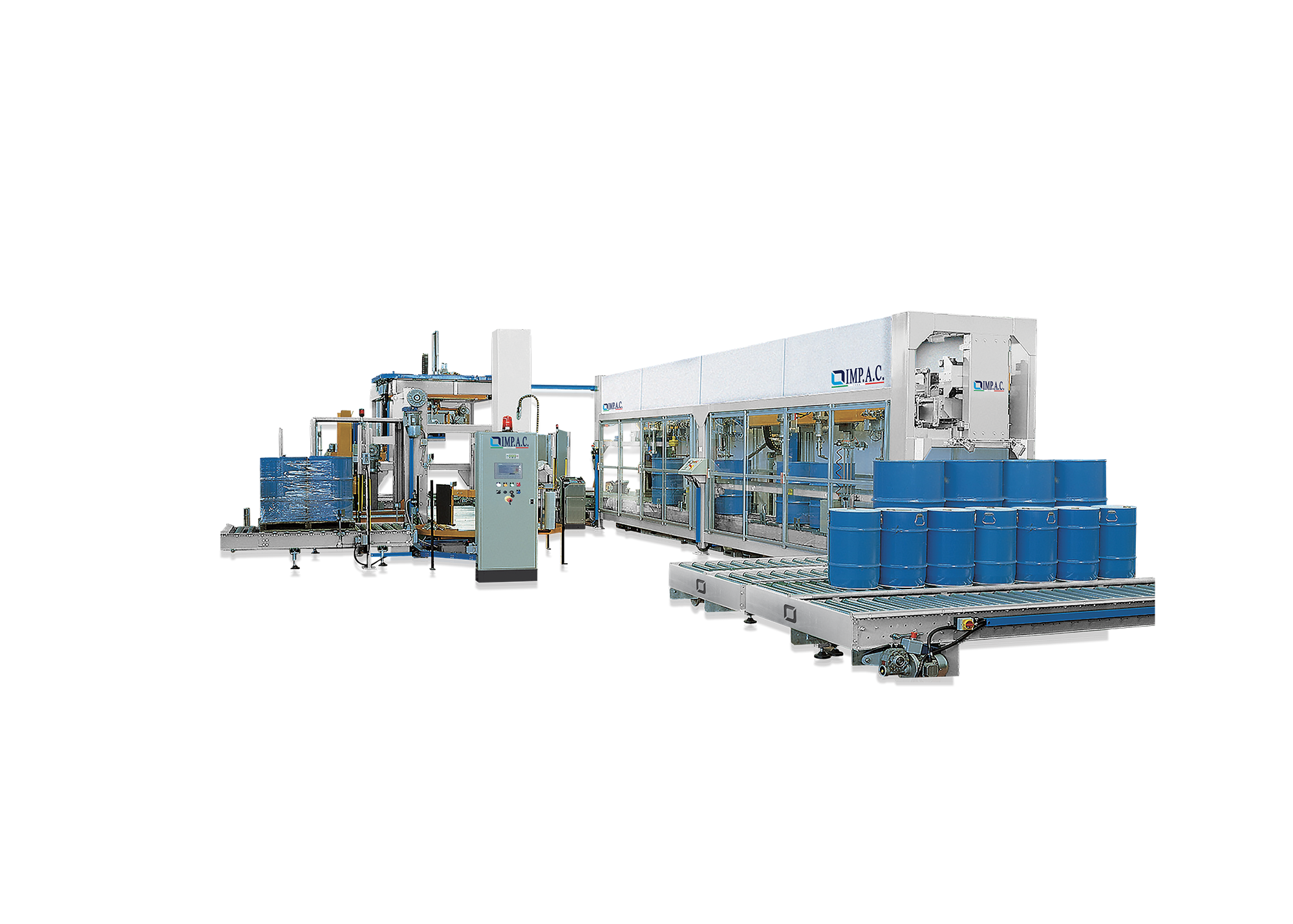 L'IMP.A.C. 56 A2 AS è un impianto ideale per automatizzare il processo di riempimento di prodotti chimici in fusti con bocchello da 2" e open top con peso variabile da 60 a 220 litri.