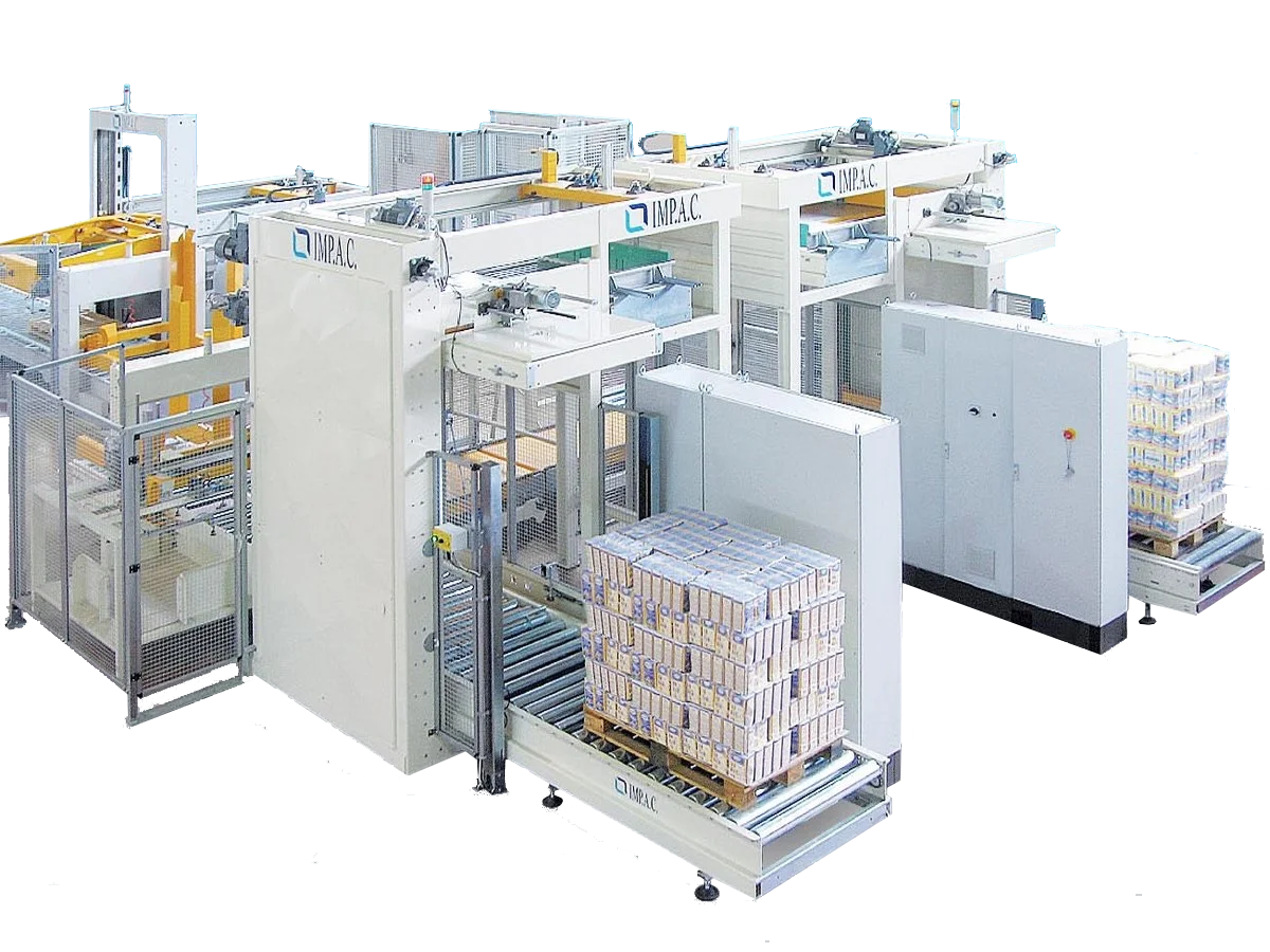 Il pallettizzatore IMP.A.C. 21 AV è la soluzione ideale per le esigenze di alta produttività, con una capacità massima di 2000 cartoni-fardelli/ora.