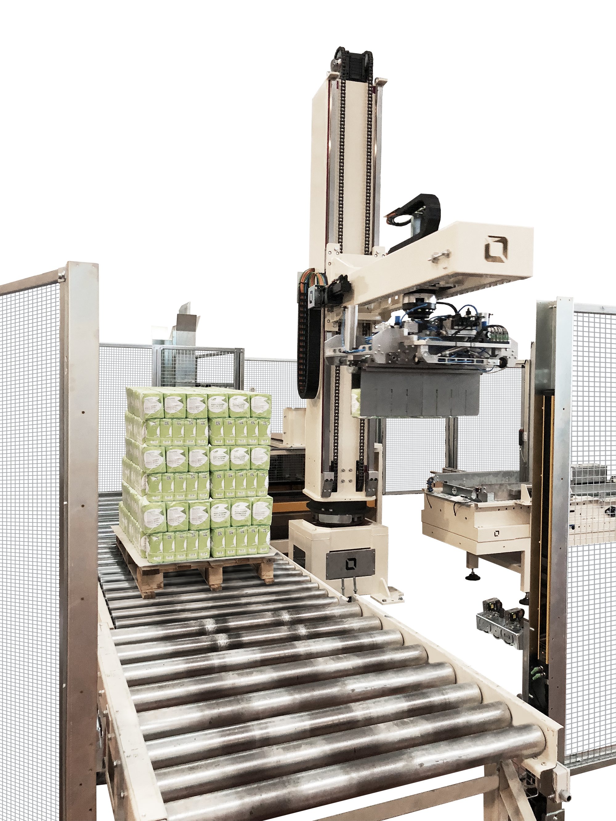 Pallettizzatore automatico mono colonna con sistema di trasporto pallet
